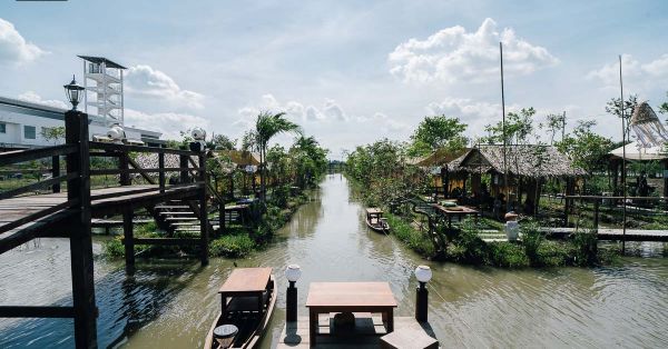 ใช้เรือเสิร์ฟอาหาร โซนที่นั่งเอาท์ดอร์ในสวนผักริมคูน้ำ